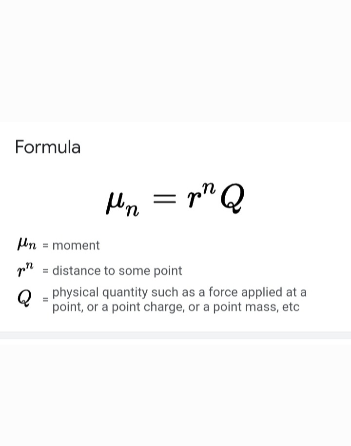 In physics, a moment is a mathematical expression involving the product of a distance and physical quantity. Moments are usually defined with respect to a fixed reference point and refer to physical quantities located some distance from the reference point.